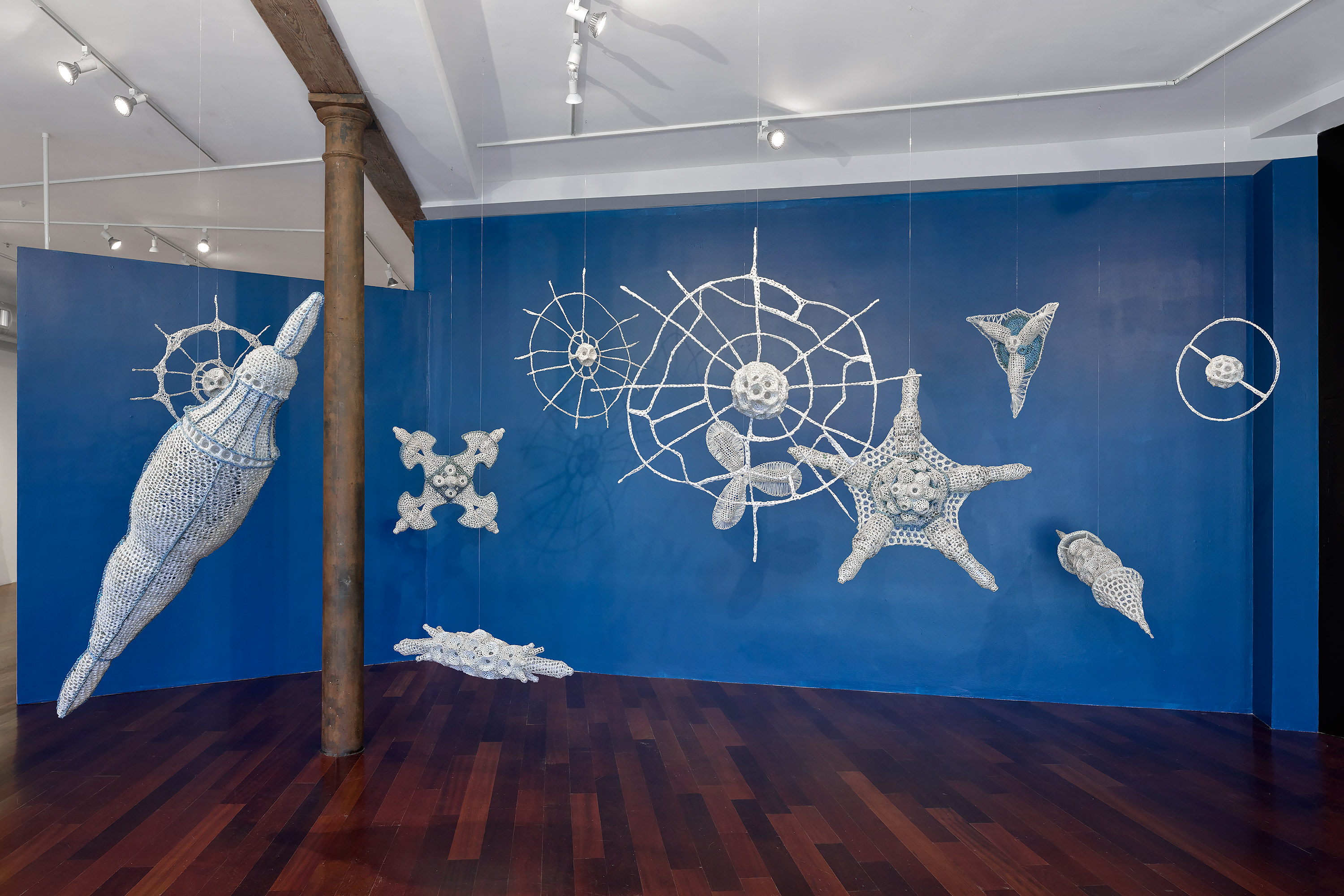 We must address discarded plastic remnants of human presence in nature, particularly in our oceans where life sustaining floating microcosms are being choked out by plastic waste. This installation features single use plastic formed into sculptural representations of marine phytoplankton. Inspired by the similarities in the shapes of some of the discarded plastics and marine organisms, I have used discarded plastic as building components in these rep- resentations of magical and otherworldly marine life to create an immersive environment of wonder and warning.